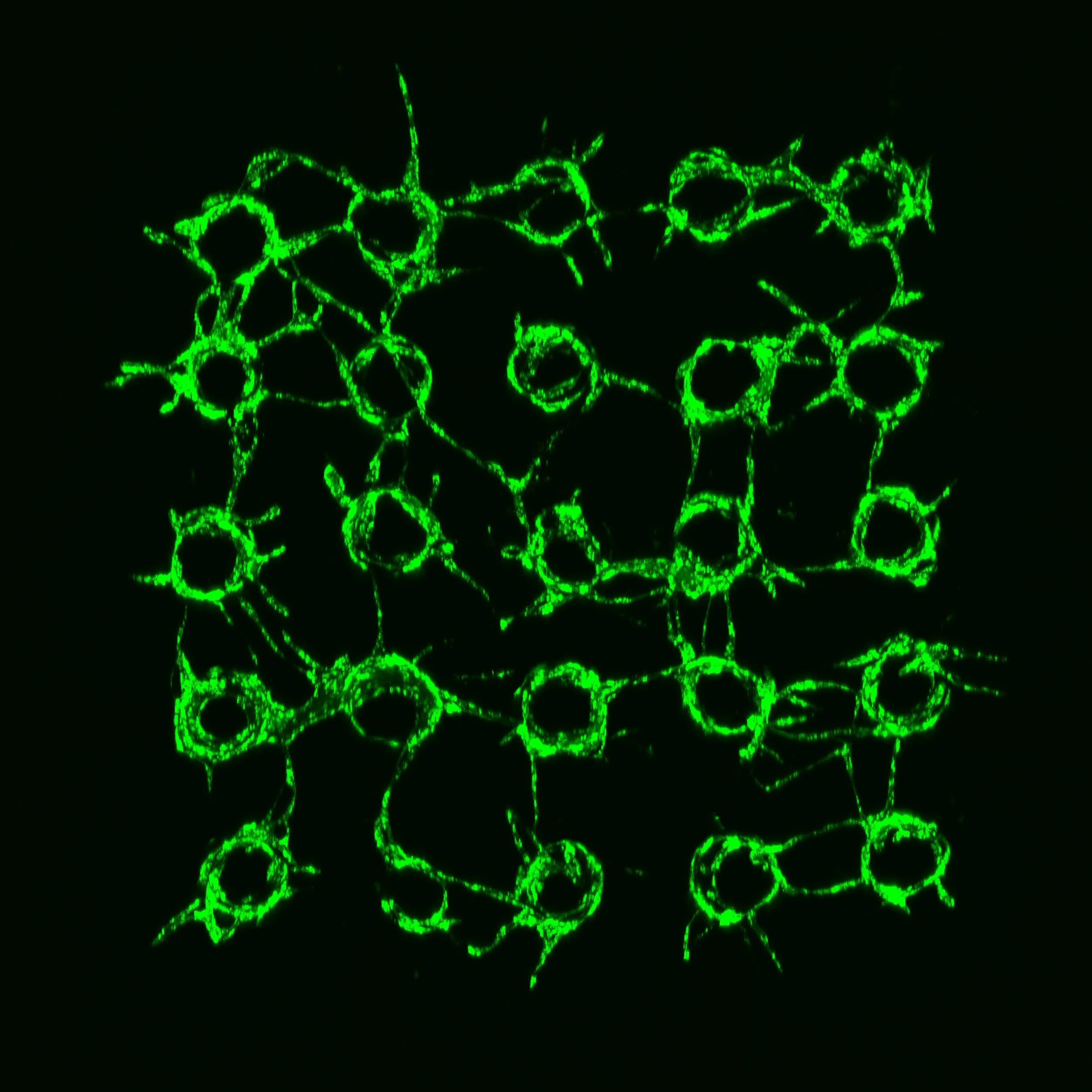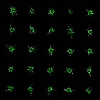 Vascular microtissues visualised with GFP (green). Cancer cells not labeled.